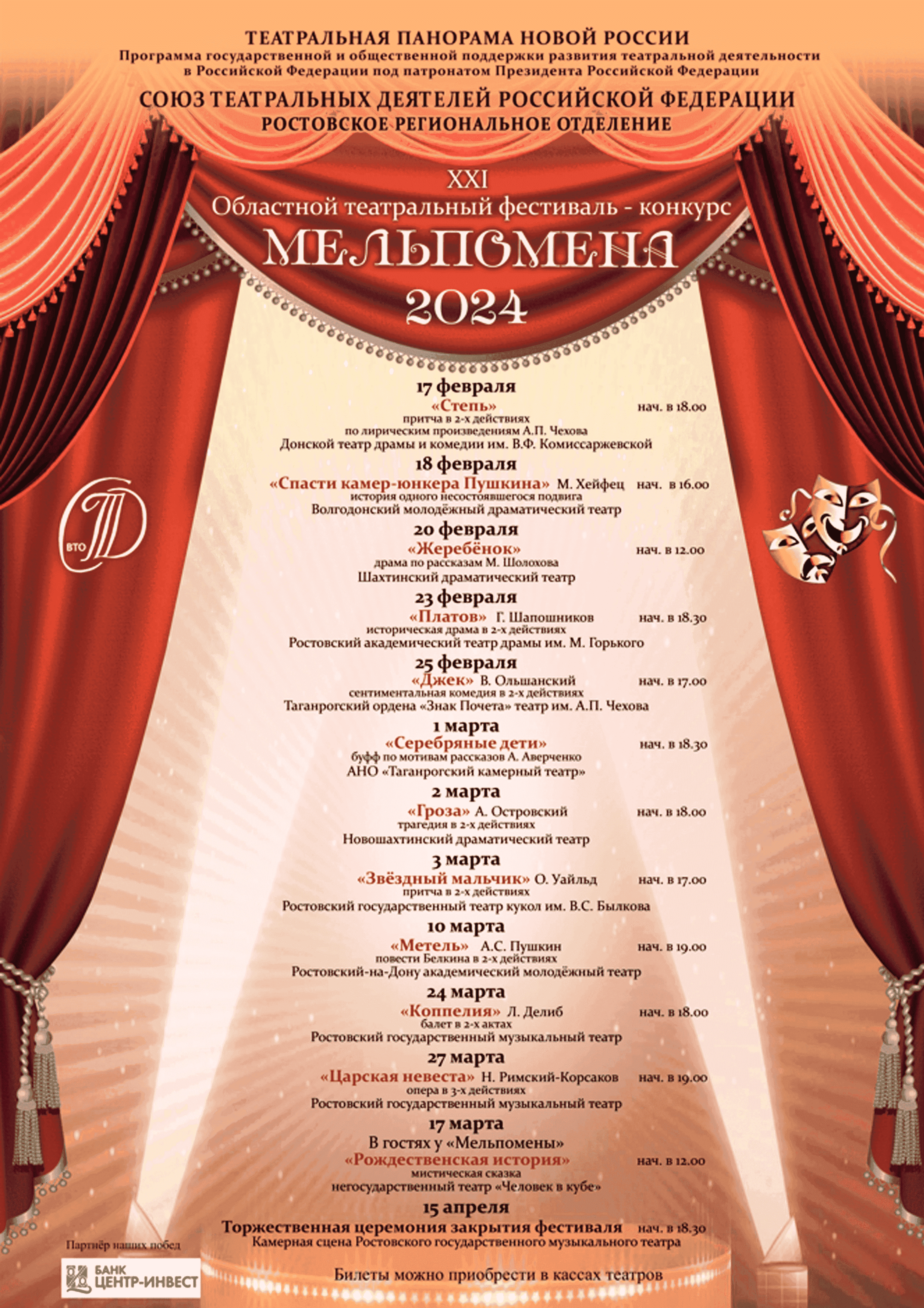 Следуя театральной традиции, «17» февраля 2024 года стартует XXI областной театральный фестиваль-конкурс «Мельпомена». Учрежденный Правлением Ростовского регионального отделения СТД РФ в 1997 году, фестиваль не изменяет целям и задачам – сохранению и развитию традиций Донского театра, выявлению лучших творческих работ в различных жанрах и видах театрального искусства, укрепляет единое культурное пространство, поддерживает творческие инициативы артистов. Но самое важное - обеспечивает зрительский интерес к театральной палитре спектаклей и отмечает наградами самых достойных служителей Мельпомены.