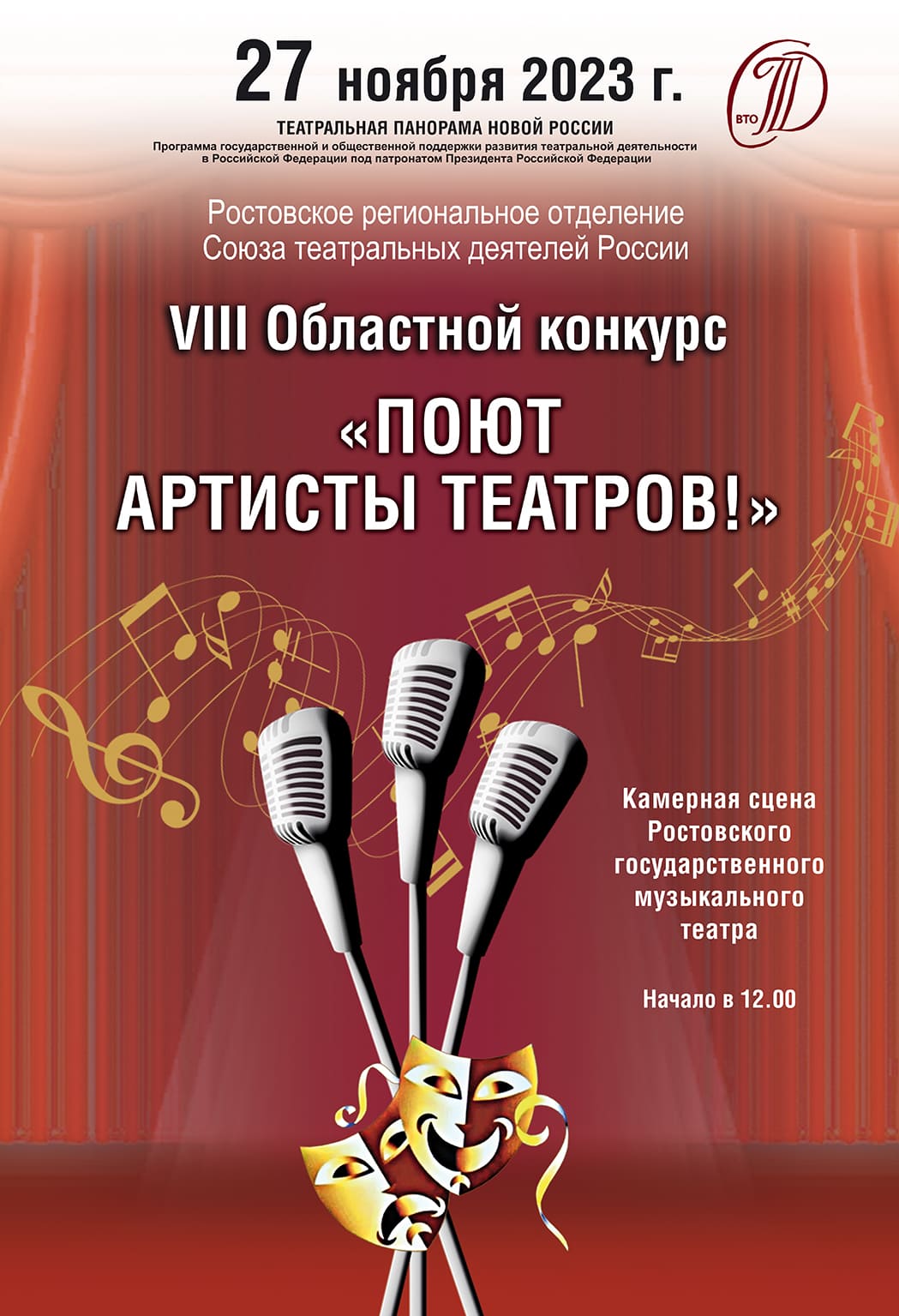 «27» ноября 2023 года на камерной сцене Ростовского музыкального театра состоится VIII областной конкурс «Поют артисты театров». Учрежденный Правлением Ростовского регионального отделения СТД РФ в 2016 г., конкурс не изменяет целям и задачам: